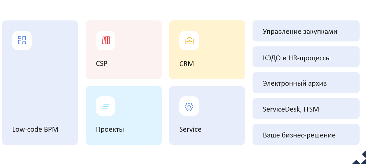 Платформа является базой для построения продуктов и систем различных классов, включая управление продажами и потребительским опытом (CRM+CX), электронный документооборот (ECM), проекты, закупки (SRM), сервисные службы (ESM) и другие области.